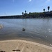 Two Mallard ducks swim peacefully near a breakwater lined with iconic Canary Island date palms.